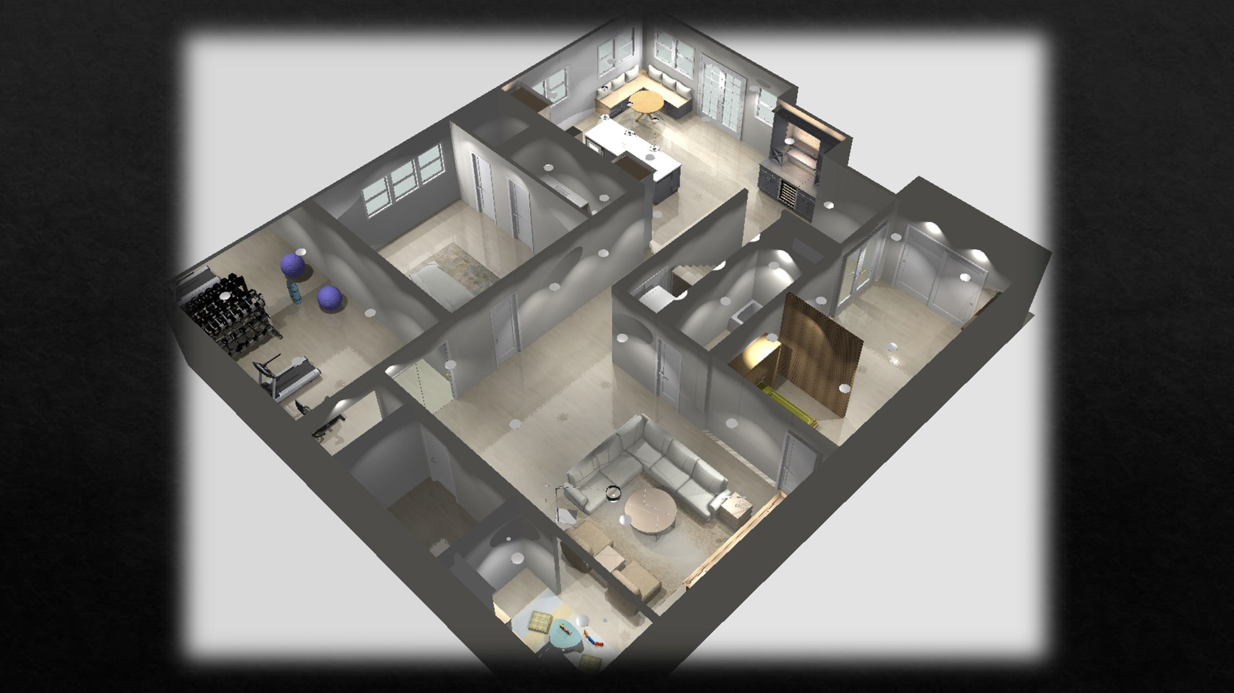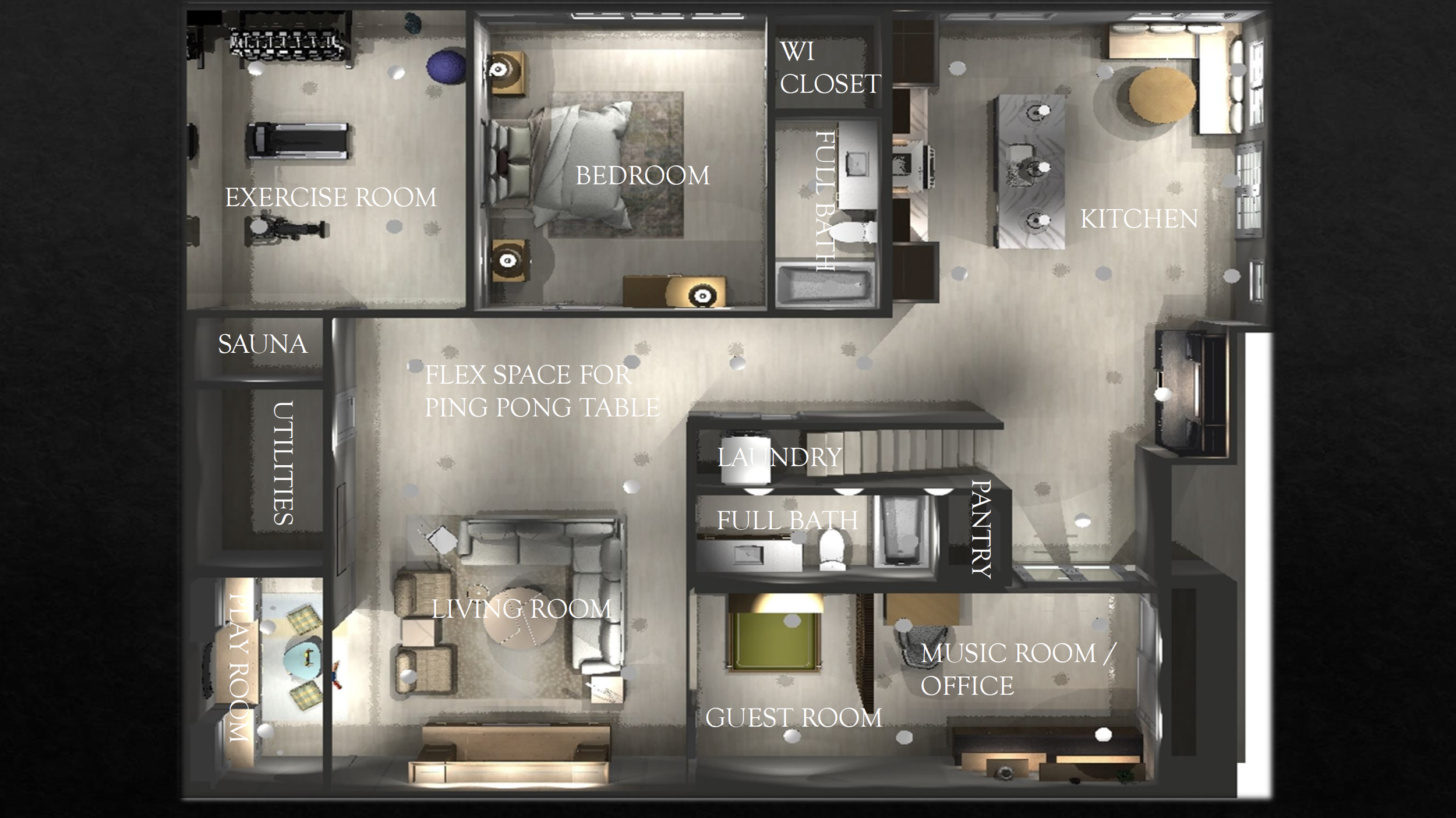 Additional spaces were created for a workout room, laundry room, office, and a comfortable living area featuring a built-in entertainment center with floating shelves.